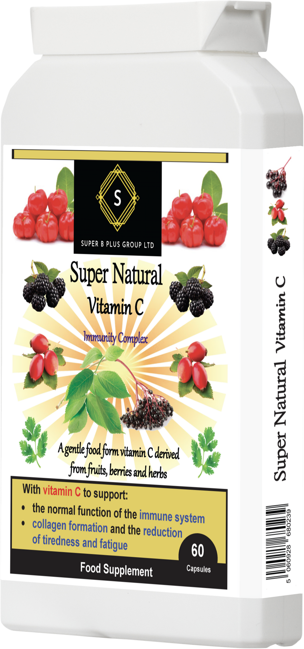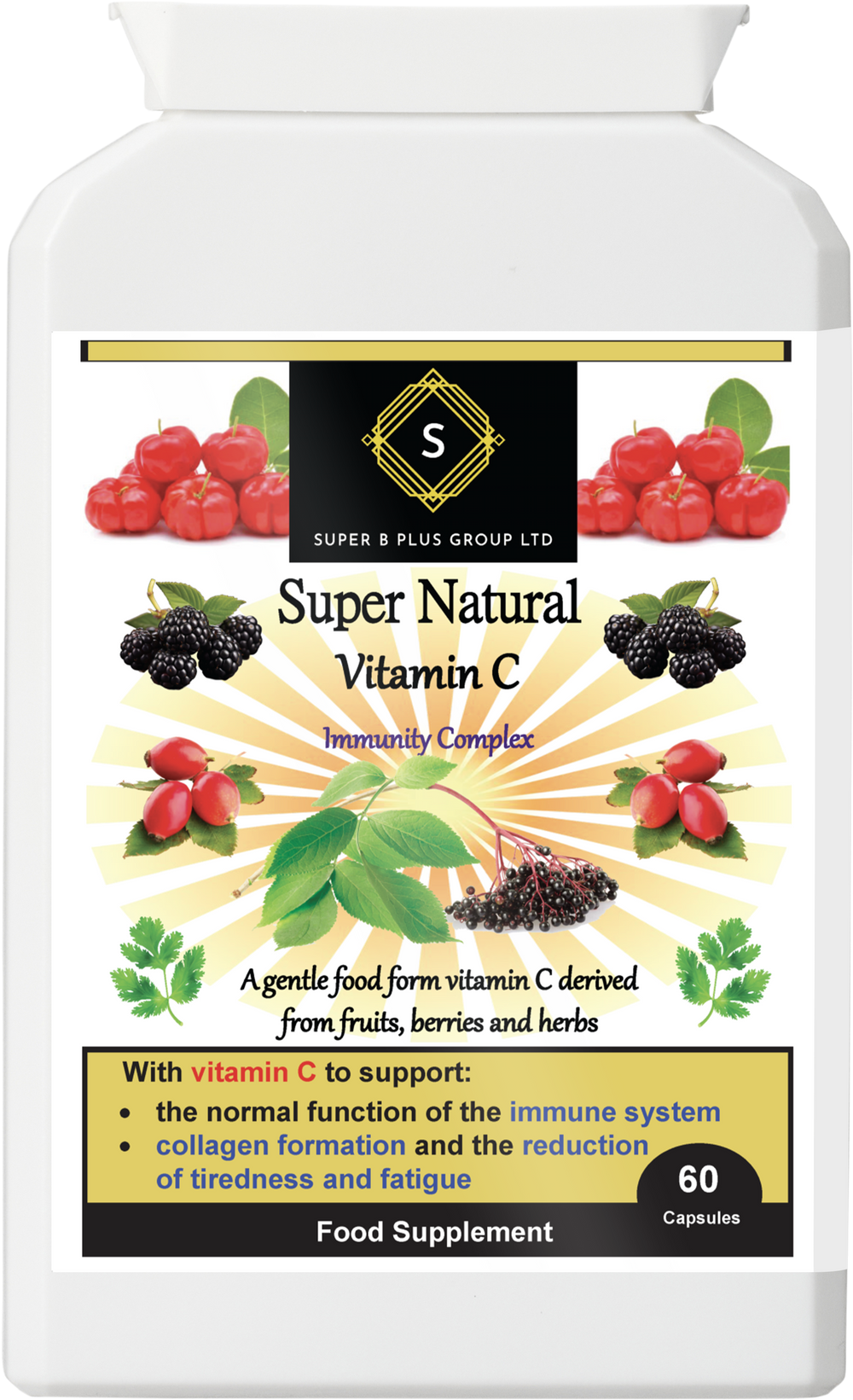 Super Natural Vitamin C is a food-form Vitamin C supplement derived from a vibrant blend of fruits and herbs. Our formula features Acerola Cherry, Rosehip, Blackberry, Parsley Leaf, and Elderberry, providing a gentle, non-acidic, and readily absorbable source of this essential vitamin. This vegetarian and vegan-friendly supplement is also gluten-free and dairy-free.