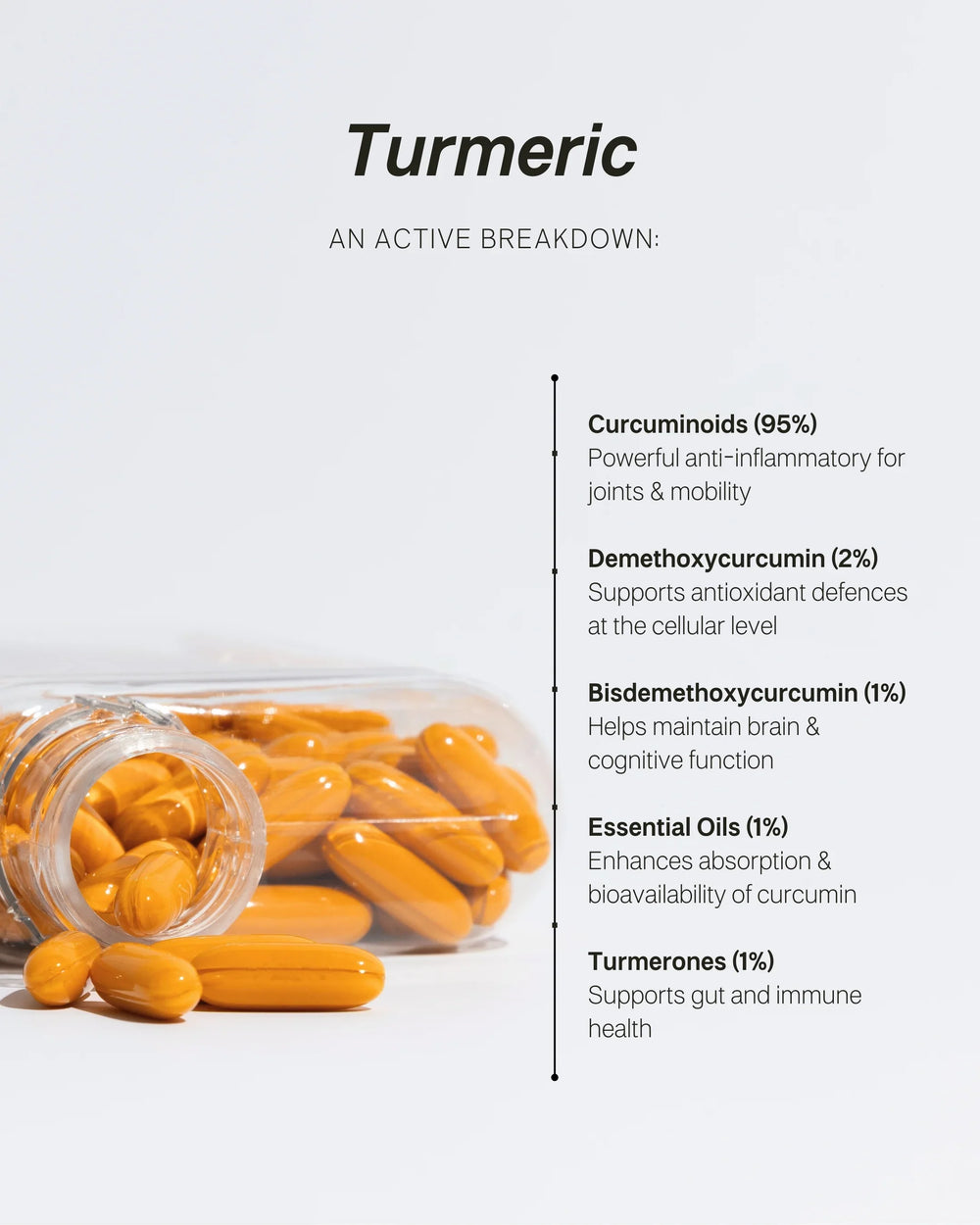 Ingredients: Curcuminoids (including curcumin), turmeric oils (turmerones), and other naturally occurring bioactives