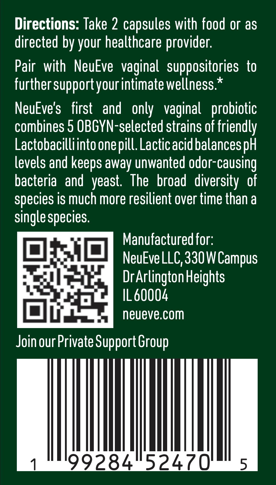 Directions: Take 2 capsules daily with food. For best results, use at the same time as NeuEve vaginal suppositories, to reseed with good bacteria.